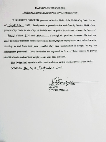 Due to Hurricane Sally, Mayor Stimpson has ordered a curfew from 7 PM to 6 AM. Crews are working on clearing trees from roadways and utility companies are working on restoring power and downed power lines. Stay tuned for more updates.
