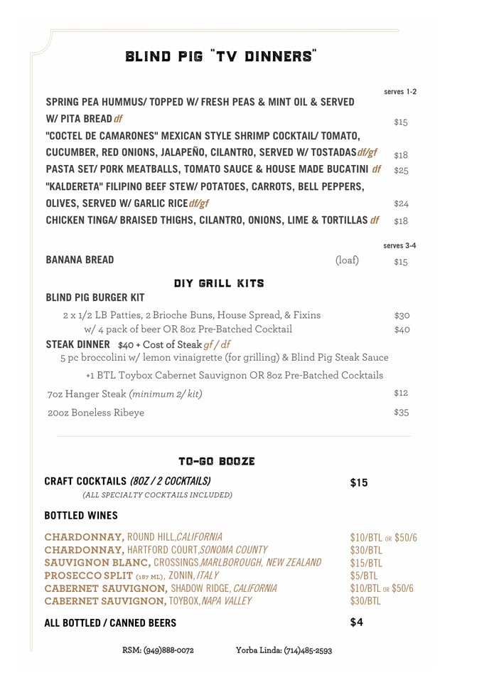 Blind Pig's pick-up menu changes weekly, offering "TV dinners" for one to two people, grilling kits and a selection of alcohol. Patrons without growlers can purchase canned and bottled beer. See the current to-go menu here.
