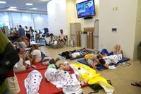 People lie on cots as they wait for news at a family reunification center, after a wing of a 12-story beachfront condo building collapsed last Thursday in Surfside, Fla.