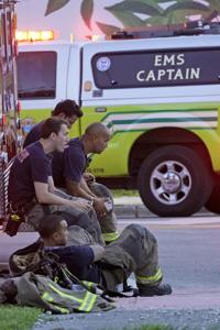 Firefighters wait near the site of a partial building collapse, Thursday, June 24, 2021, in Surfside, Fla.