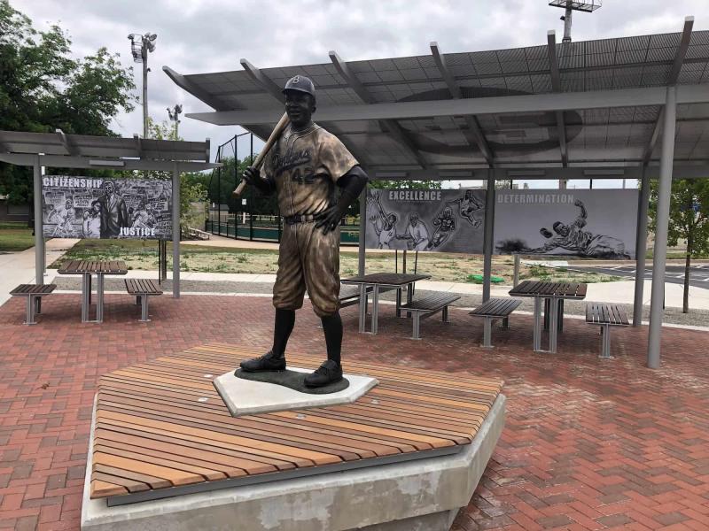 Right behind the newly installed Jackie Robinson bronze statue at McAdams Park are several picnic tables to enjoy a bite to eat. This park features hike and bike trails, a playground, a football field named after Wichita native Barry Sanders, swimming pool, courts for tetherball, volleyball and more. It also serves as the location for League 42, an affordable youth baseball program named in honor of Jackie Robinson.