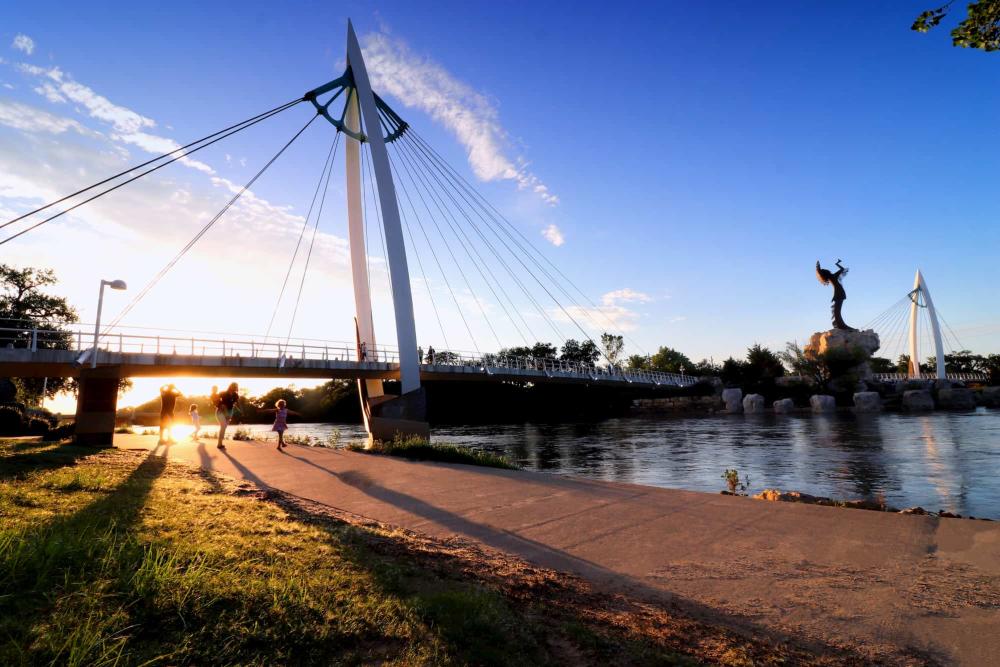 Surrounding the Keeper is a plaza, complete with exhibits that depict the Plains Indians’ way of life and representing the four elements essential to life – earth, air, water and fire. Access to the plaza area is by two bow-and-arrow-inspired cable-stay bridges or through the Mid-America All-Indian Museum during the day. The entire area is wheelchair accessible. From the plaza, paths for walking, biking and more are available on both banks of the Arkansas River.