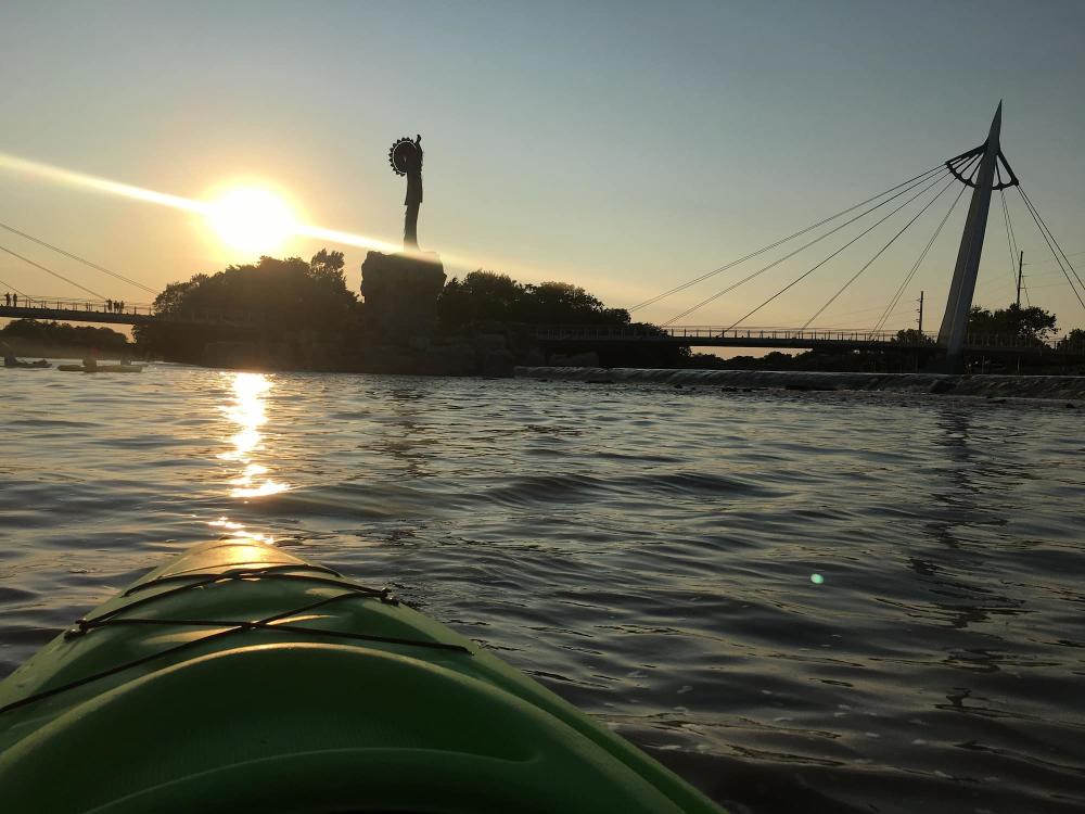 "My husband and I don’t own a kayak or paddleboard and we wanted to see the Keeper of the Plains at sunset from the water, so we signed up for a tour offered by Wichita Park & Recreation. On a summer Friday evening, we headed downtown after work and met others who had pre-registered for the Floatin’ on the River Sunset Tour. About a dozen people chose kayaks and another dozen were on paddleboards, each group getting a brief training before launching into the water from the ramp just south of the Wichita Boathouse.
