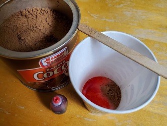Now let’s create your wound. First, you’ll need to color your glue to slightly darker than the color of your skin. Use cocoa powder and food coloring, but only add a tiny bit at a time. You can always add more, but once your glue is too dark you can’t take any pigment back out. I used exactly 1 drop of red and 1 drop of yellow with a tiny sprinkle of cocoa.