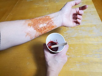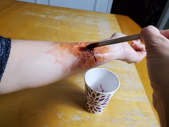 On movie sets, special effects make-up artists use a wide variety of materials to create fake wounds. Sometimes they shape the wound directly on the actor’s body each day using wax or liquid latex, which is a similar process to what we’re doing (we’re just using materials that are more readily on-hand). Other times they may create a prosthetic wound using silicone, resin, or a 3D printer. These wounds are glued on with special skin-safe adhesive, removed at the end of the day, and reapplied if the actor needs to wear it again.