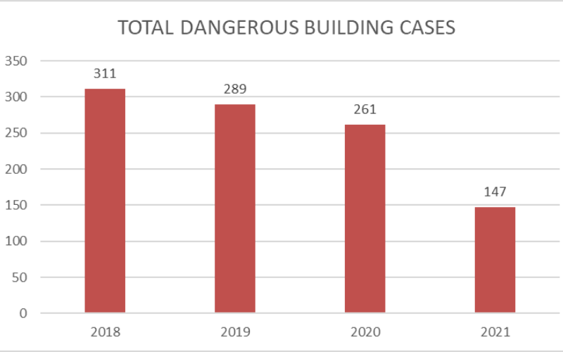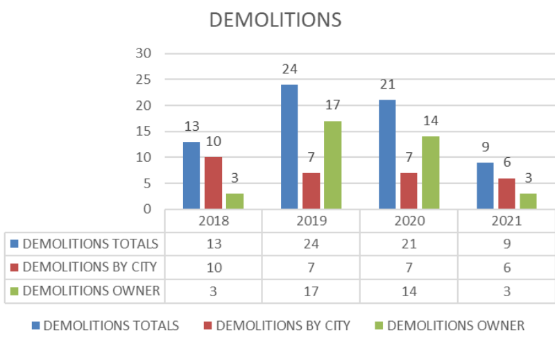 In 2020, we had 261 dangerous building designations, which resulted in 20 demolitions. So far in 2021, we have had 147 designations with 9 demolitions.