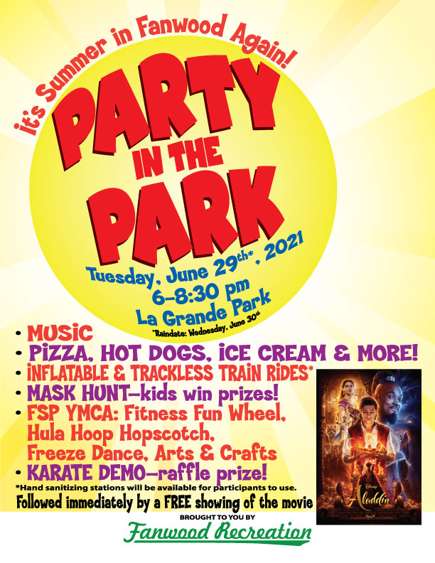 Fanwood Recreation is excited to kick off our Free Summer Movie Series in La Grande Park with the Party in the Park on Tuesday June 29th from 6 – 8:30pm. The party will offer family fun for all ages including music, food, inflatables, arts & crafts, and other activities. It will be followed by a screening of Aladdin that will begin at dusk.