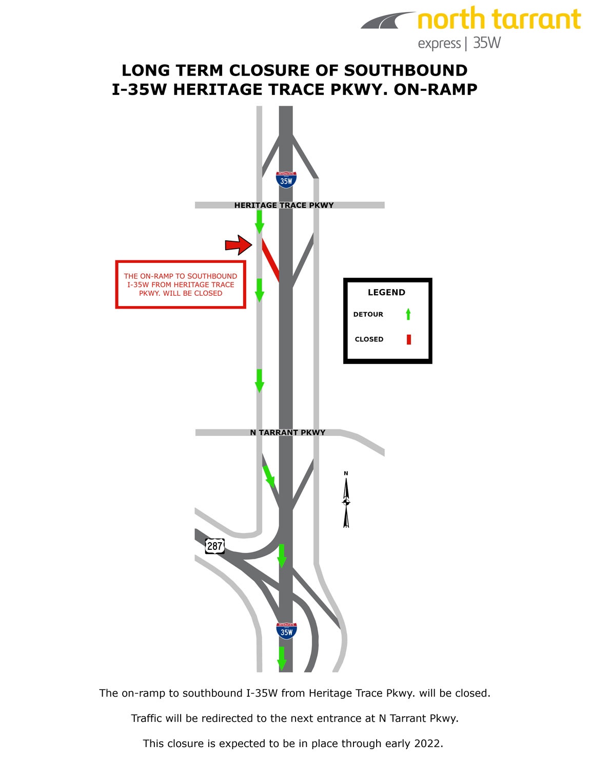On July 6, the on-ramp to southbound I-35W from Heritage Trace Parkway was closed. Traffic has been redirected to the entrance at North Tarrant Parkway. This long-term closure is expected to last through early 2022.