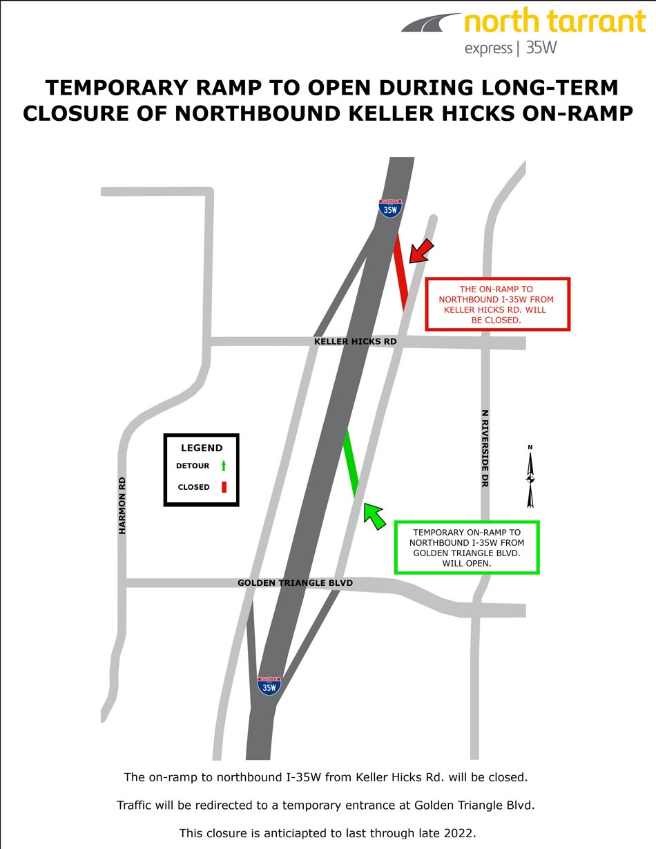 A long-term closure of the on-ramp to northbound I- 35W from Keller Hicks Road went into effect last week. Traffic is being redirected to a temporary entrance at Golden Triangle Boulevard.