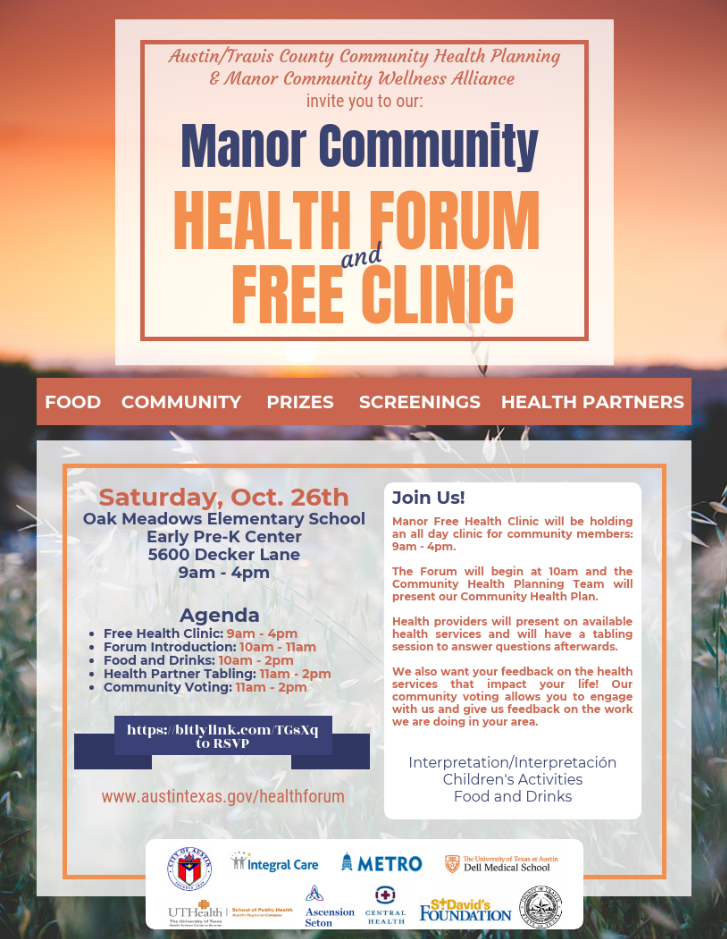 The Manor Free Health Clinic will be holding an all day clinic for community members from 9 a.m.-4 p.m. The Forum will begin at 10 a.m. and the Community Health Planning Team will present our Community Health Plan. Health providers will present on available services and will have a tabling session to answer questions afterwards. We also want your feedback on the health services that impact your life! Our community voting allows you to engage with us and give us feedback on the work we are doing in your area.