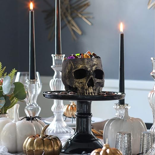 Crafting a spooky candy table is great for when trick-or-treaters ring the bell or even when you're hosting a Halloween party. First, you'll need a table cloth to set the mood, like this mysterious one adorned with a spider web design. Using a black lace table dressing is elegant enough for your home, but also gives off a mysterious ambiance. Next, you'll want to add some dark decor elements. Incorporate these vintage potion bottles featuring bats and skulls to really add some fright. And lastly, you'll need this eerie, skull-shaped candy dish to complete the ominous look.