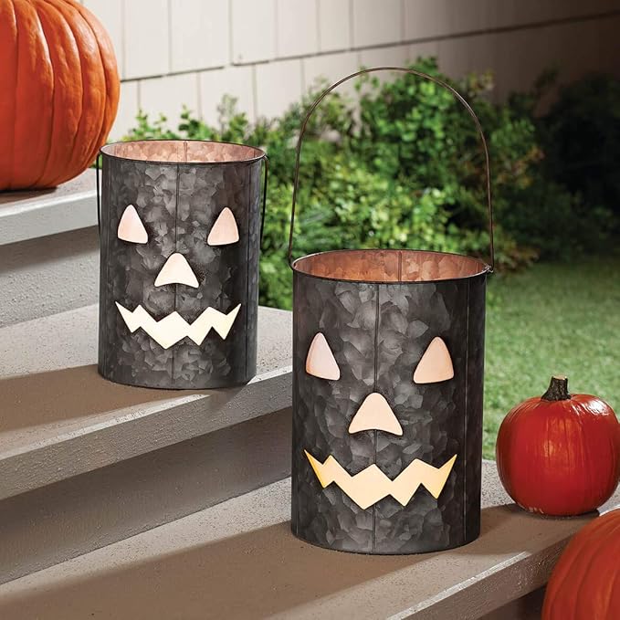Jack-o-lanterns are a festive touch that make it easier for trick-or-treaters to see in the dark. If you don't have time to hand carve your pumpkins this year, these metal buckets are the perfect addition to your haunted house. They are super versatile and can be used for toting candy, displaying fall floral arrangements or housing spooky candles. You can also check out this jack-o-lantern sporting a witch's hat.
