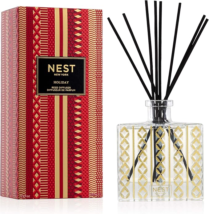 NEST Fragrances Reed Diffuser - Holiday, $48 — This oil diffuser captures all of the scents of a sparkling holiday season created by blending pomegranate, Mandarin orange, pine, cloves and cinnamon with a hint of vanilla and amber. Your loved one will appreciate its seasonal scent as well as its custom-designed glass lightly touched with gold.