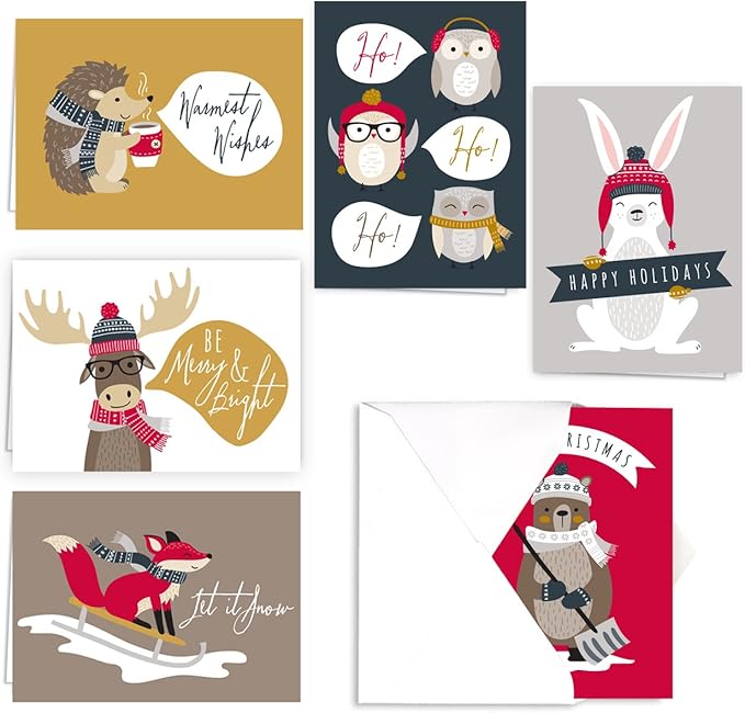 It doesn't get much cuter than these holiday cards designed with festive woodland animals. From a fuzzy porcupine offering "Warmest Wishes" to a charming bear wishing you a "Merry Christmas," all of your friends and family will love to receive these elegant cards.