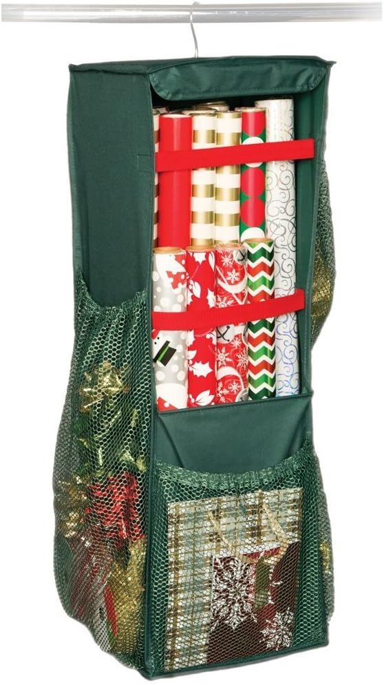 Organize all of your gift wrap paper, tissue paper, scissors, bows, ribbon, tape and other supplies in one neat place with the help of this hanging storage organizer. It fits right in your closet, holds up 20 full-size rolls of gift wrap and includes side pockets for all of your accessories.