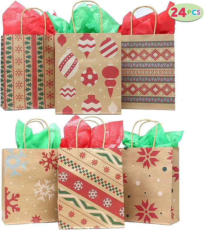 24 Christmas Kraft Gift Bags with Assorted Christmas Prints, $16.99