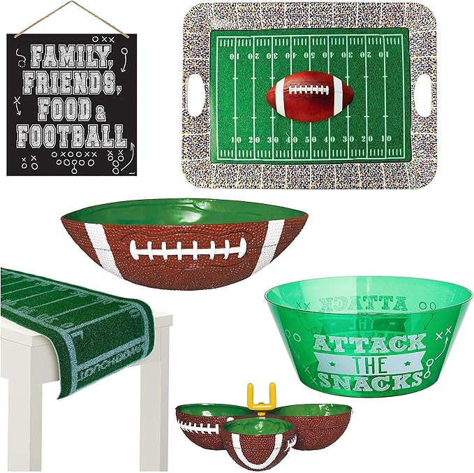 Oh, and it doesn't hurt to serve your snacks in style. This set of football serving platters and table decorations is perfect for game day. It includes a turf table runner, football-themed serving platter, and chip and dip bowls along with a festive football sign.