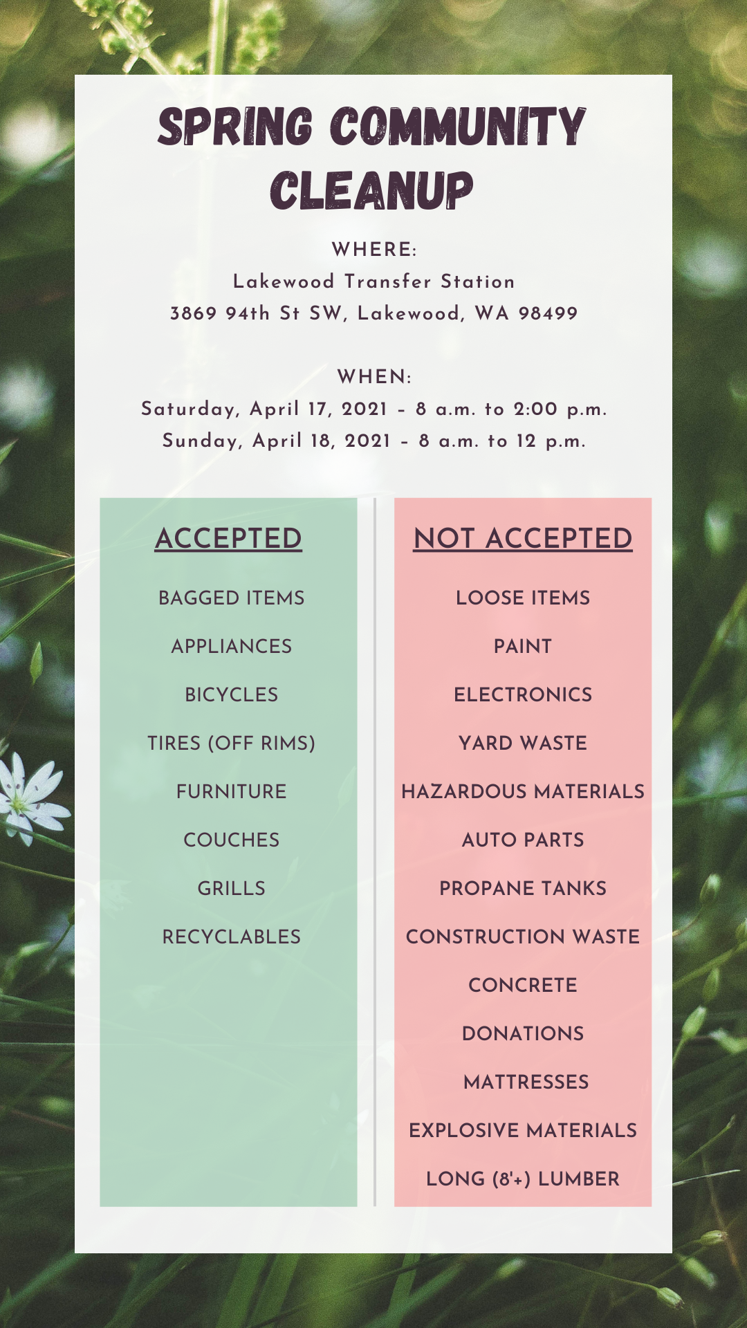 The Lakewood Spring Community Cleanup will be held at the Lakewood Transfer Station at 3869 94th St SW, Lakewood, WA 98499 on Saturday, April 17 (8:00 a.m. to 2:00 p.m.) and Sunday, April 18 (8:00 a.m. to 12:00 p.m).