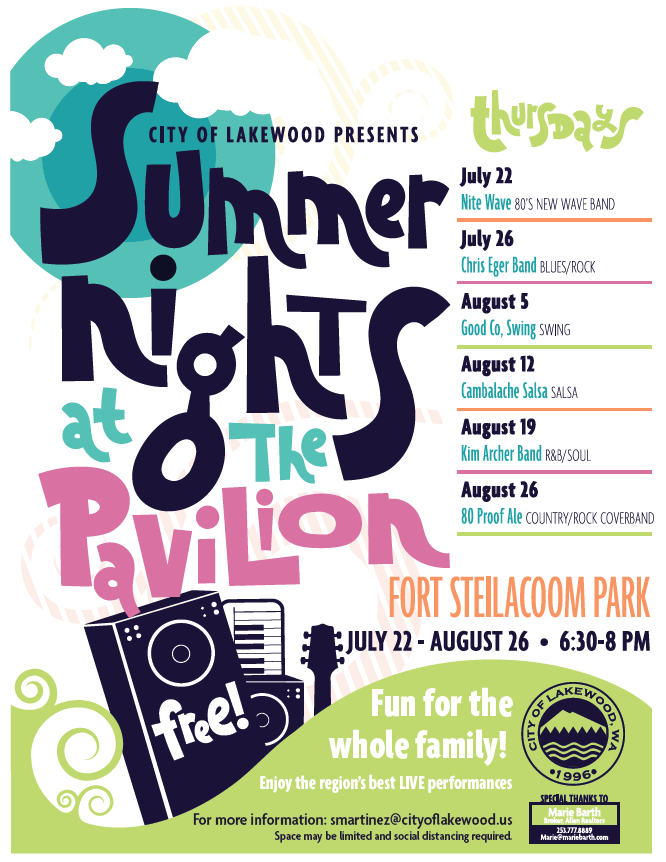 Thursday summer evenings in Lakewood, WA will be graced with live concerts at the Pavilion in Fort Steilacoom Park. The series will feature a variety of musical genres.